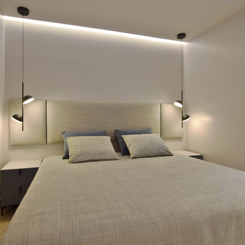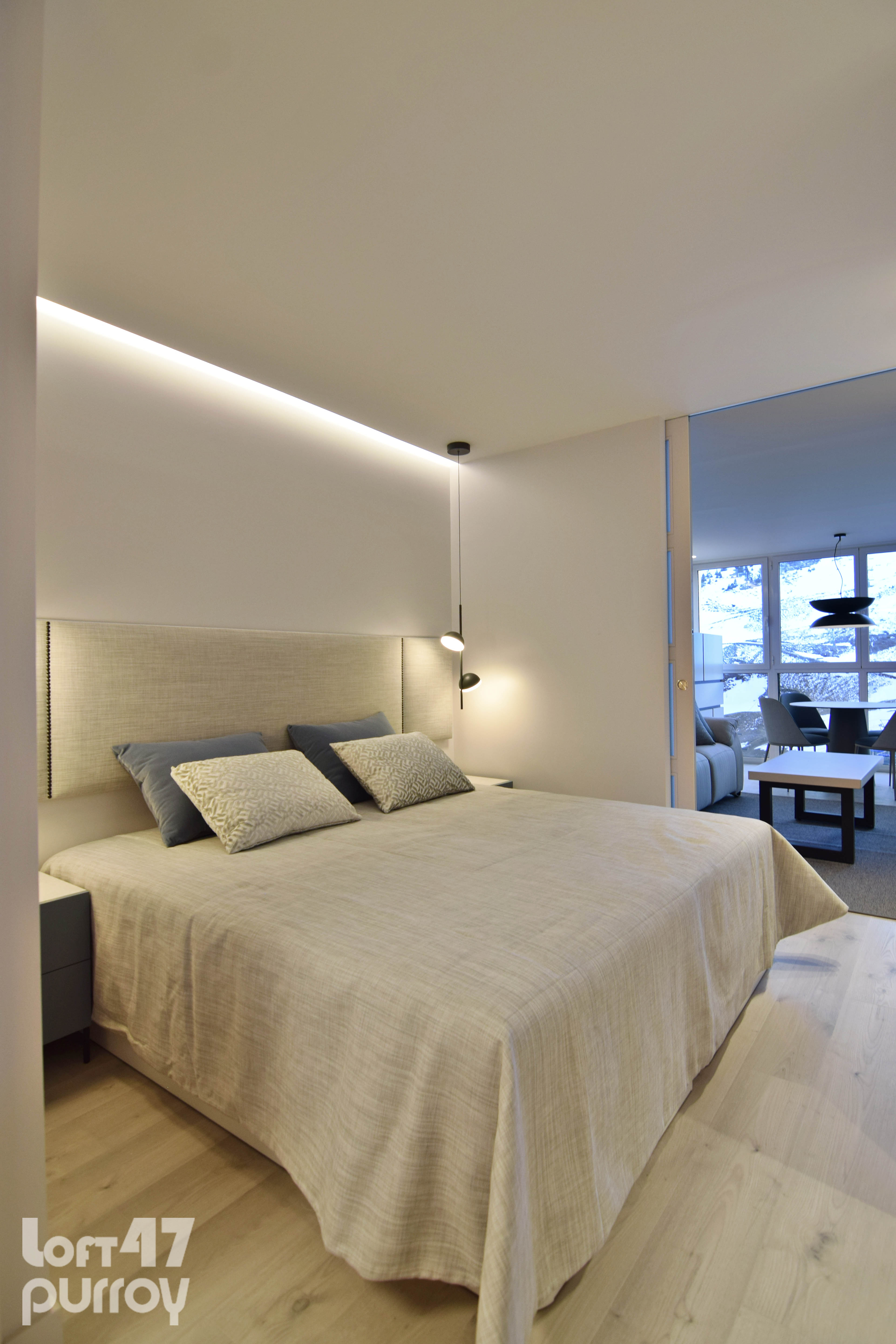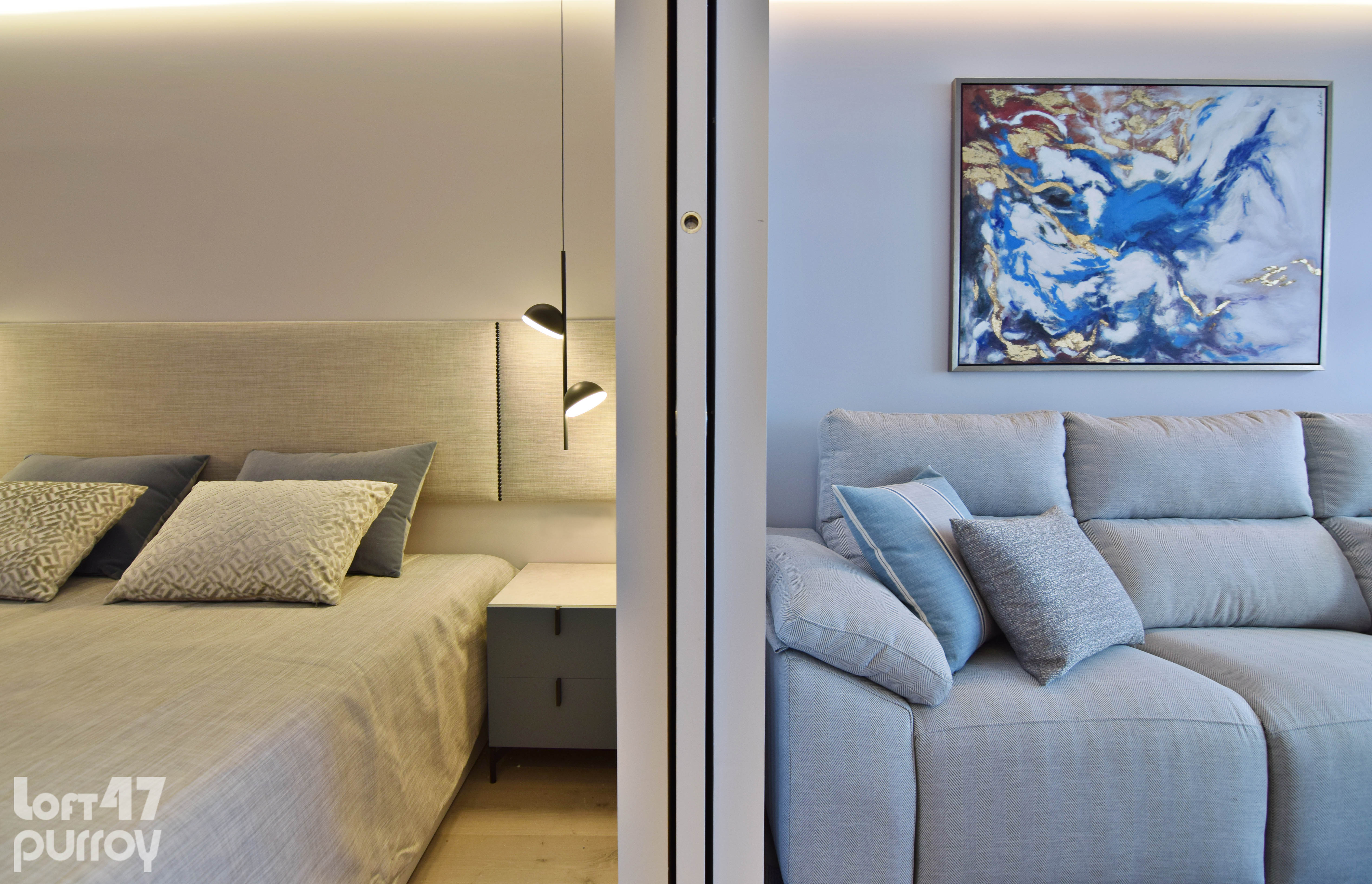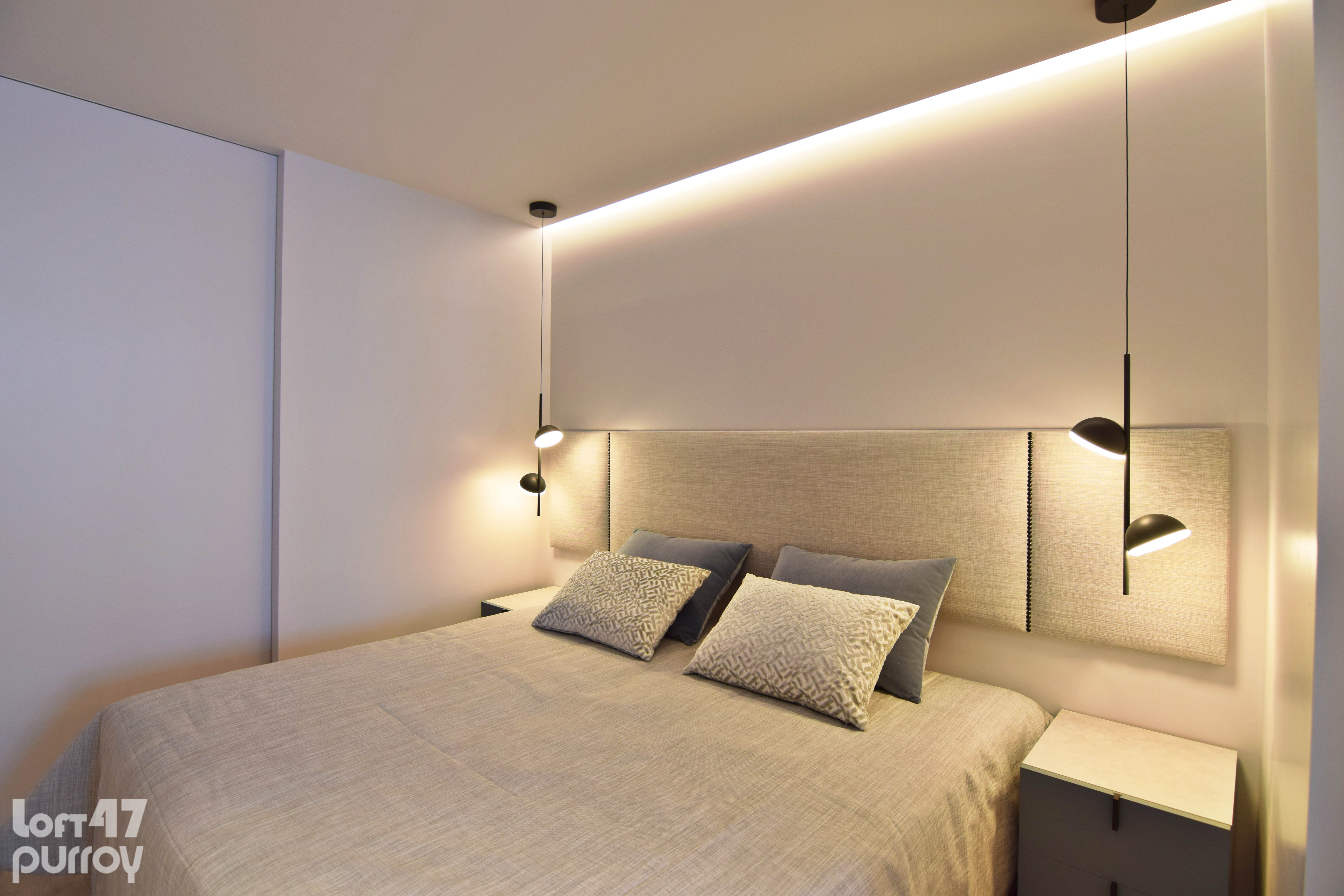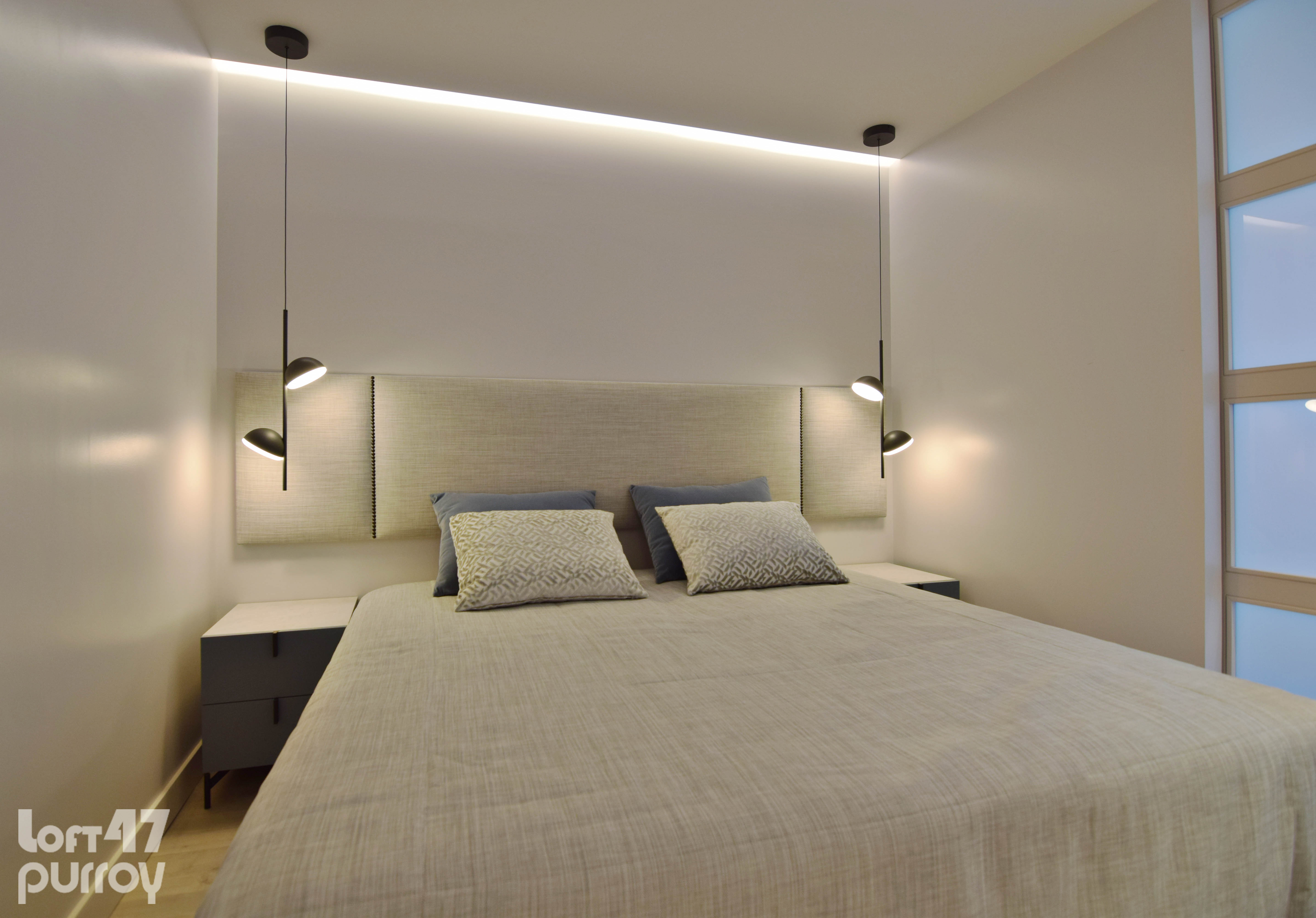 Mediante dos puertas correderas de suelo a techo separamos la zona de noche. El dormitorio principal se configura con una composición en simetría conectada por el cabecero tapizado.