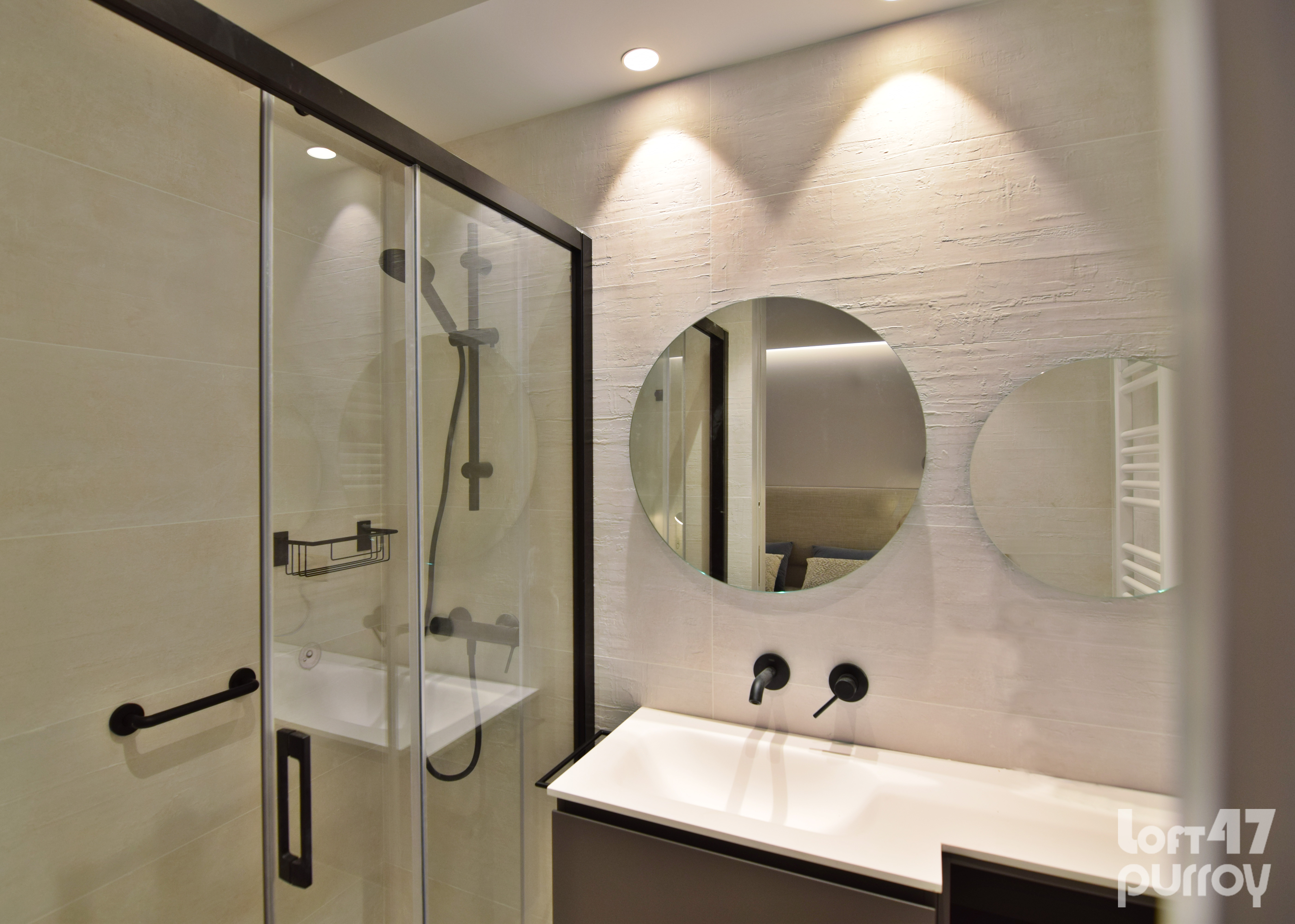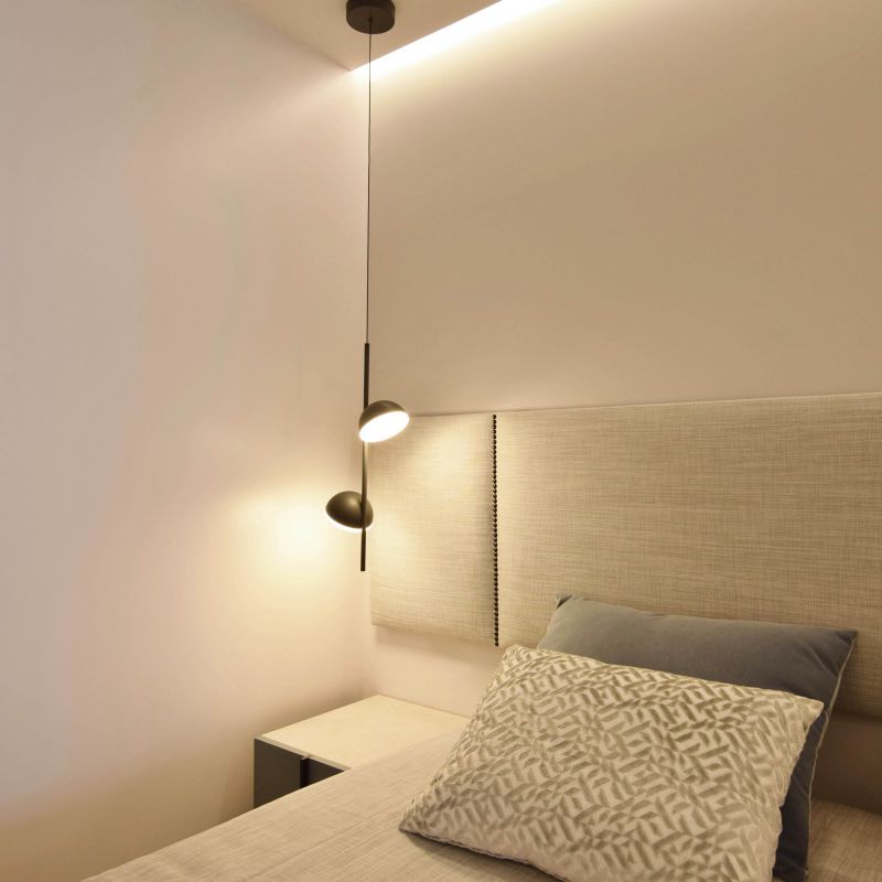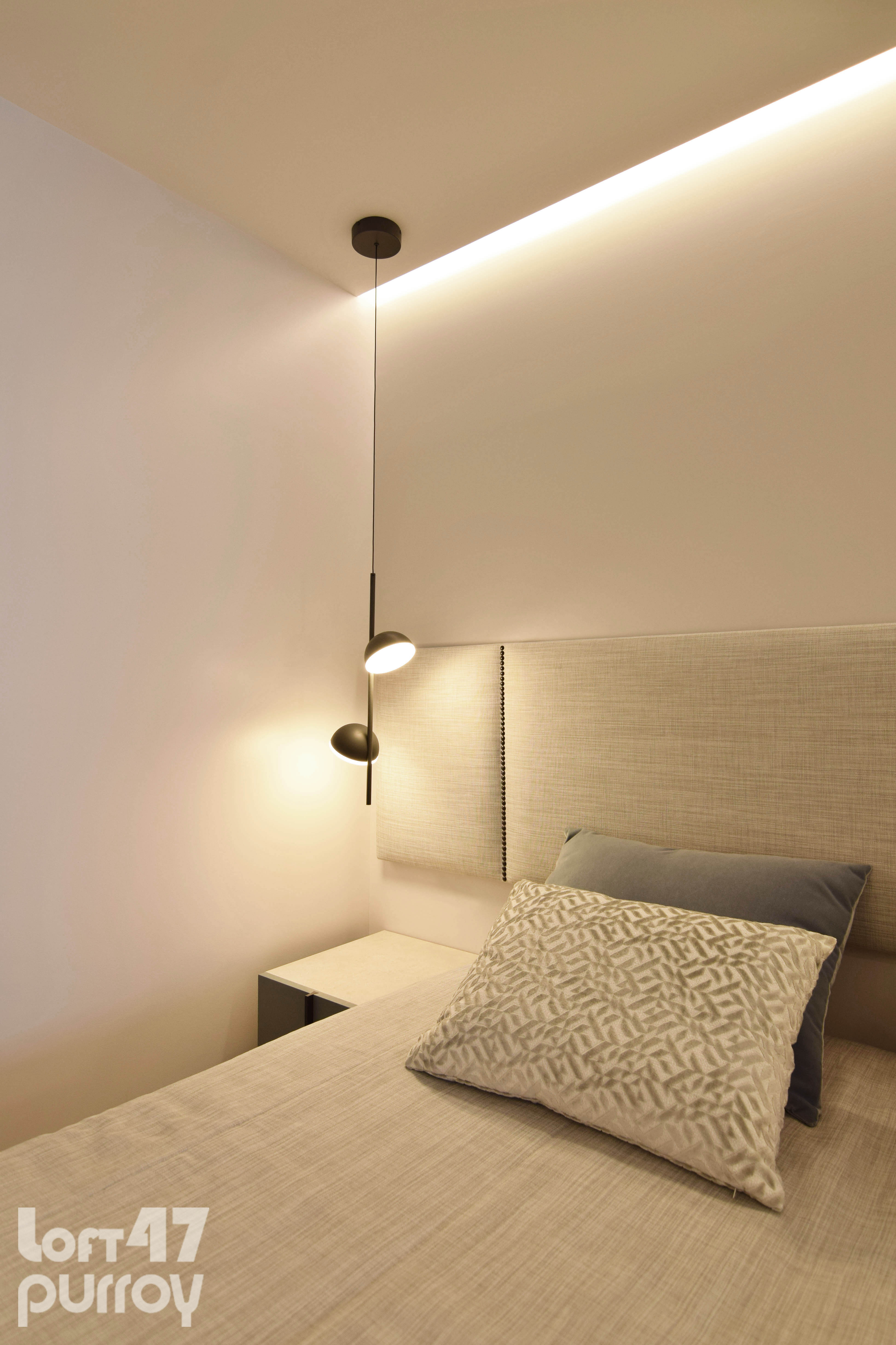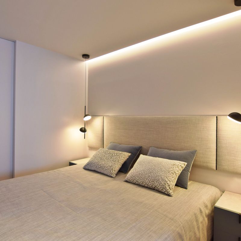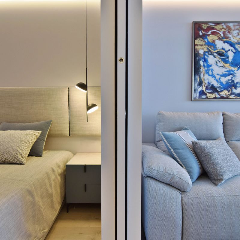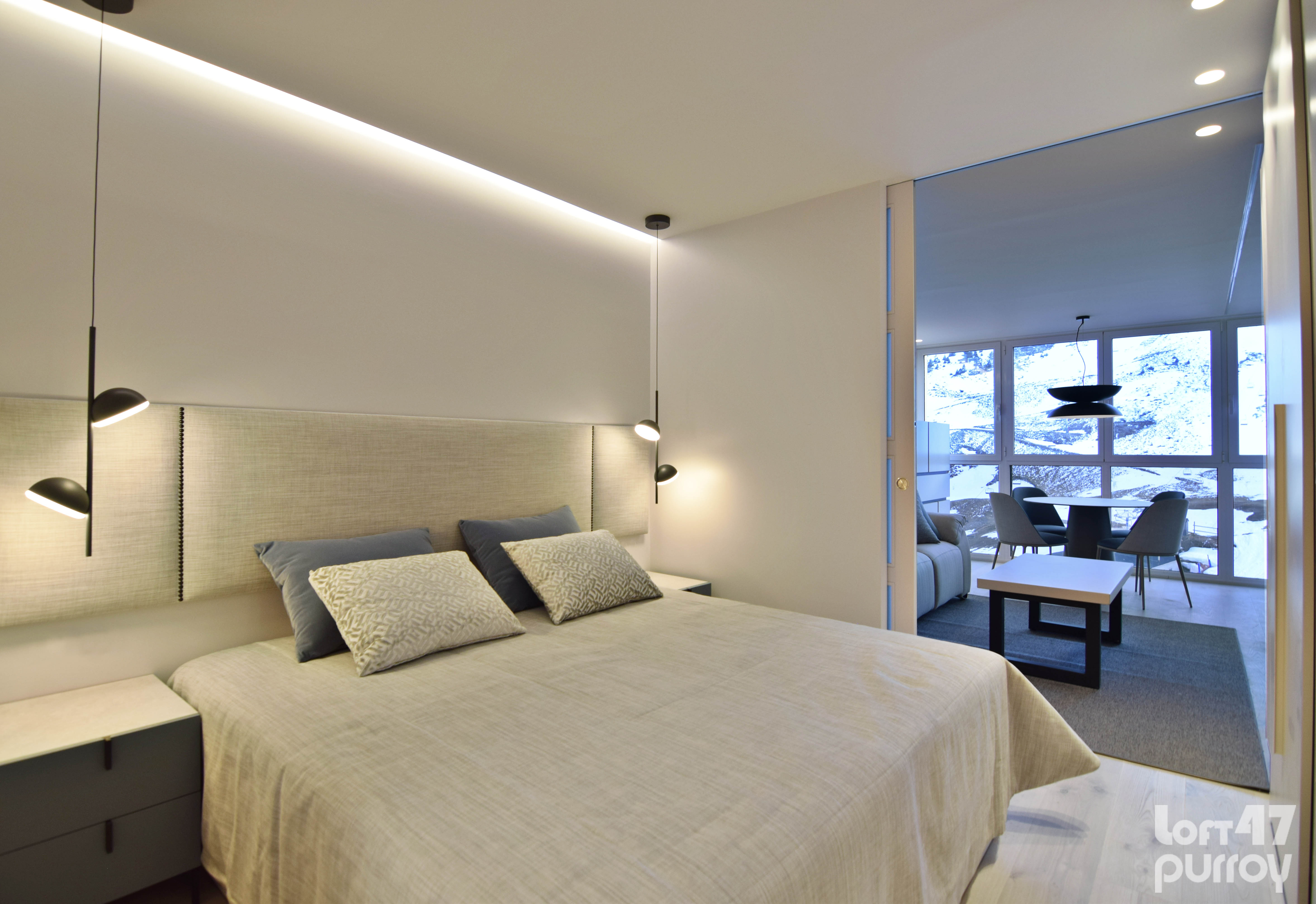 Mediante dos puertas correderas de suelo a techo separamos la zona de noche. El dormitorio principal se configura con una composición en simetría conectada por el cabecero tapizado.