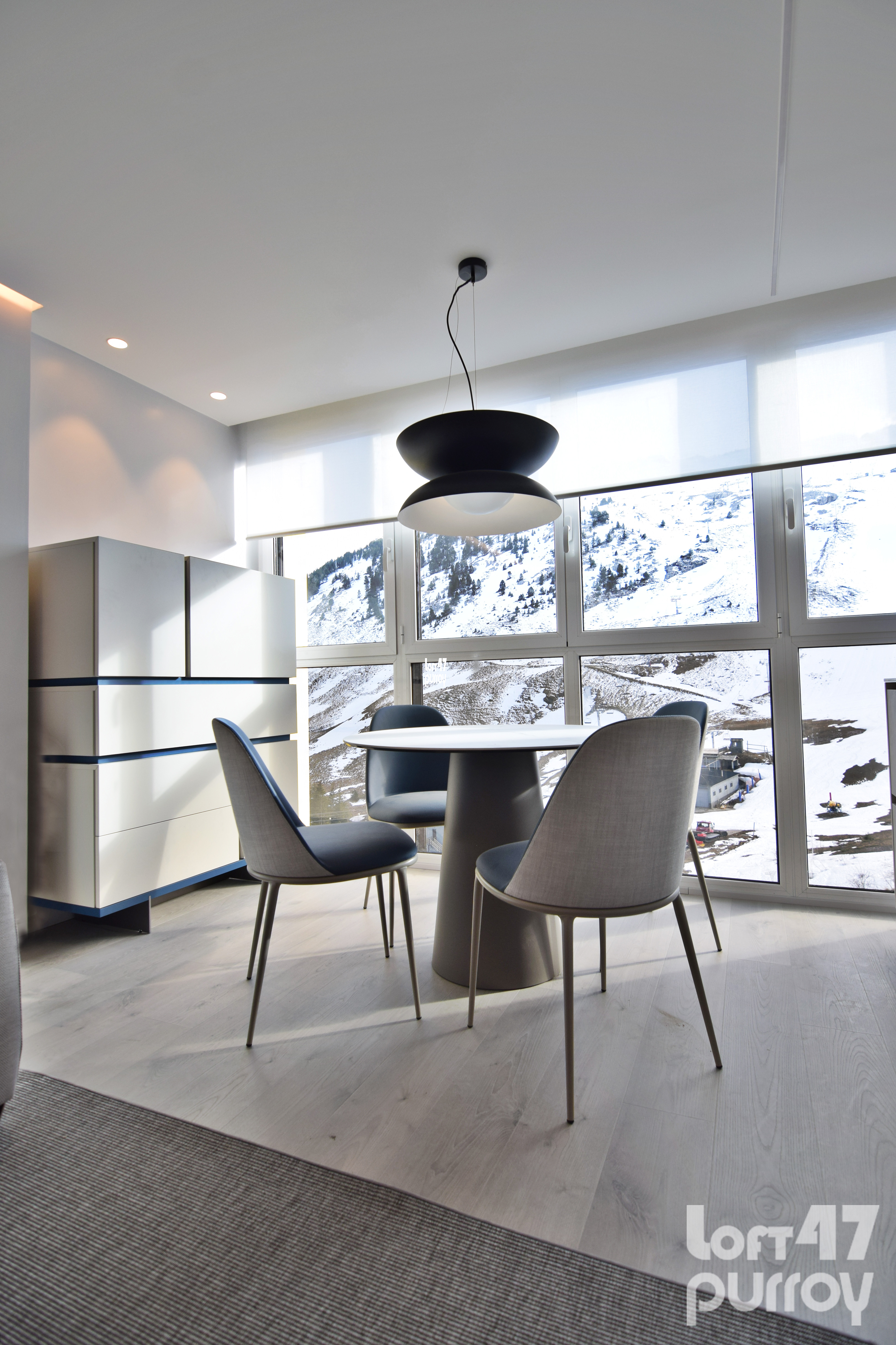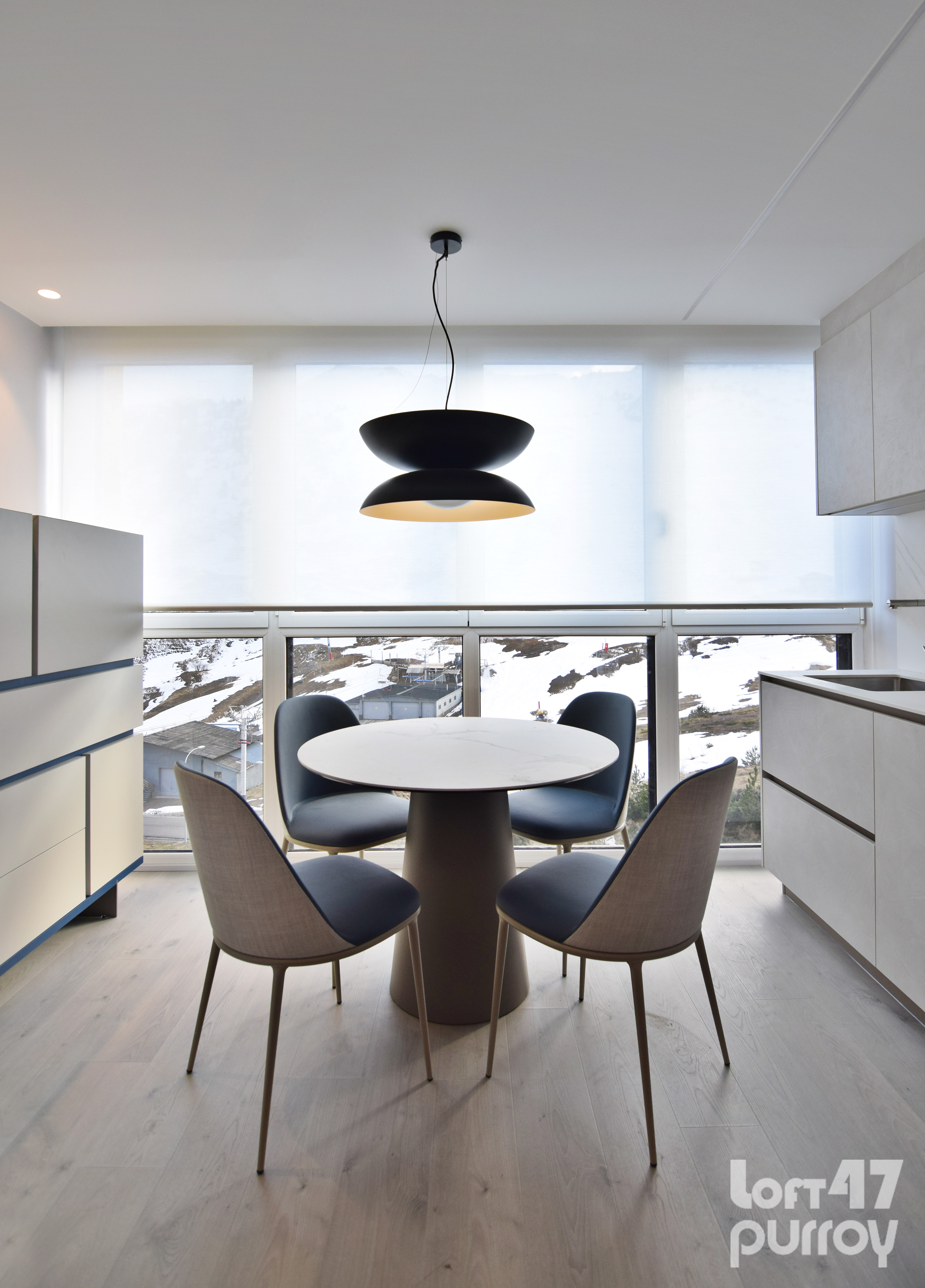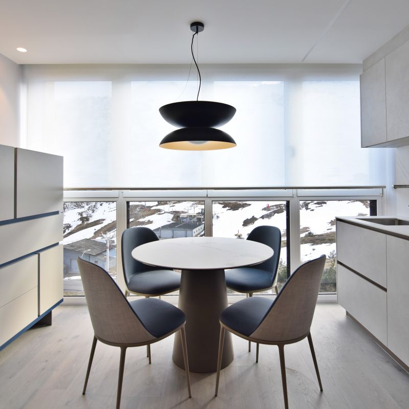 El comedor se plantea en la zona central en porcelánico. Entorno a esta, cuatro sillas combinadas en dos telas diferentes añadiendo un toque de color.