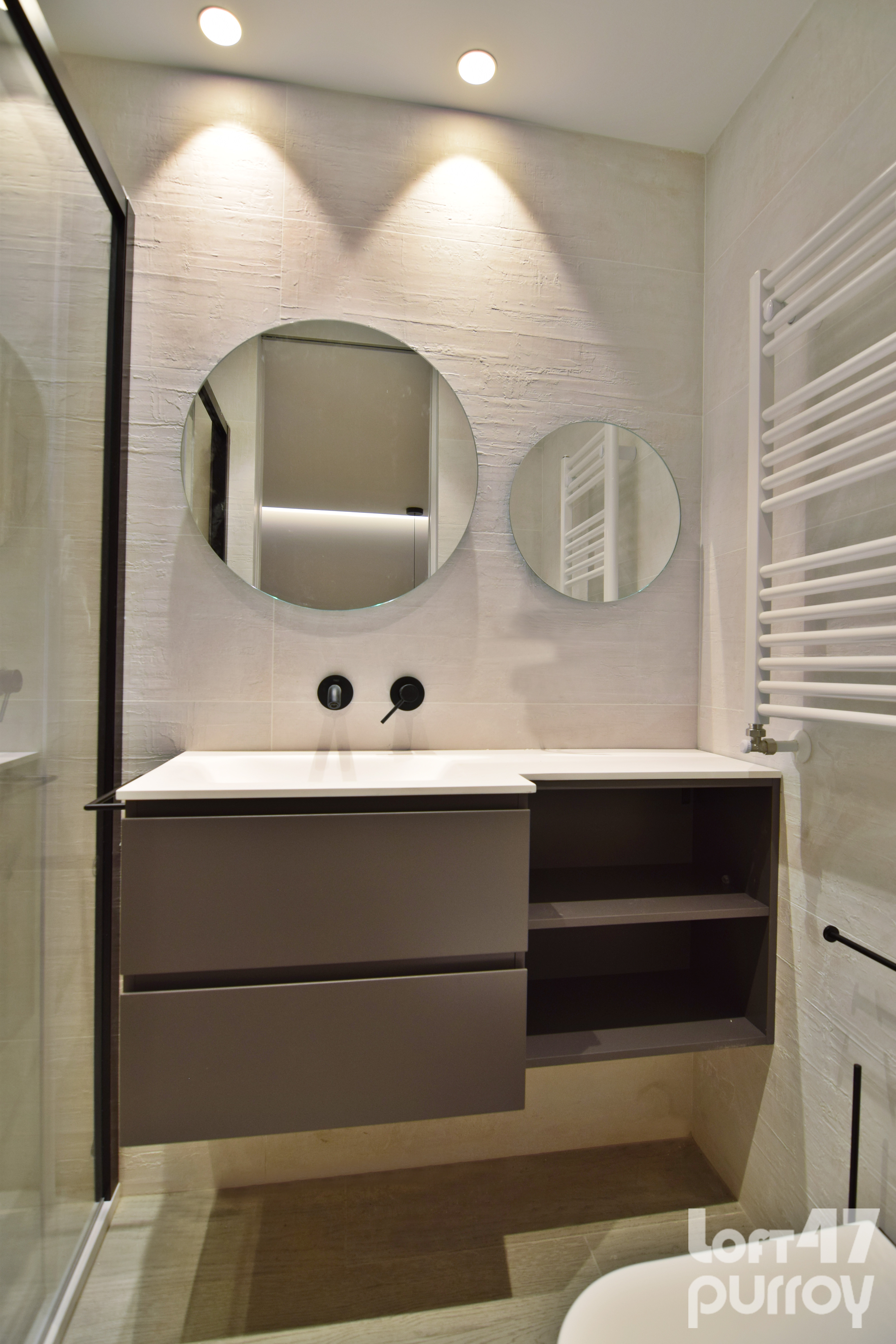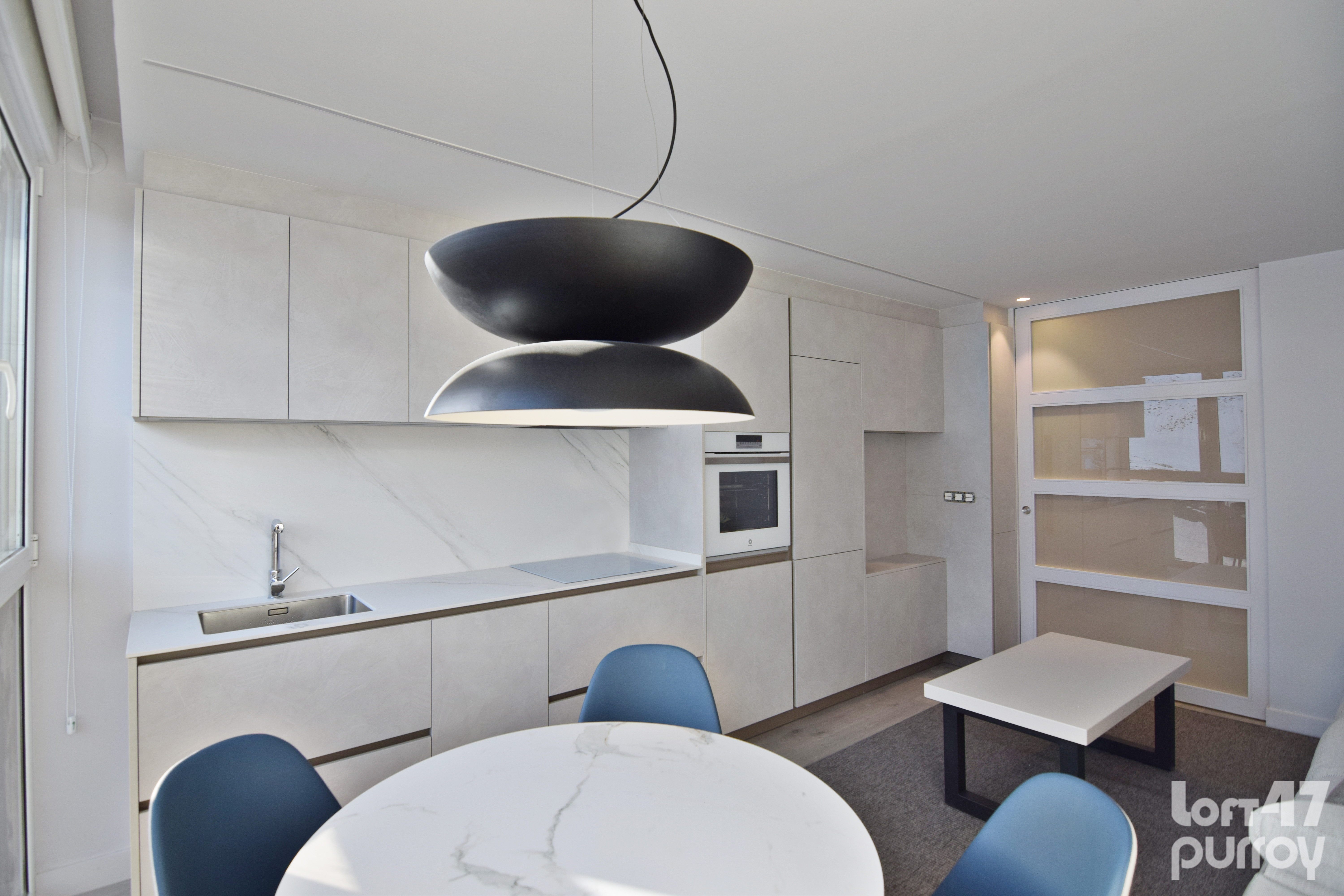 En la zona día destaca por un módulo diseñado a medida albergando el mueble de televisión y la cocina.