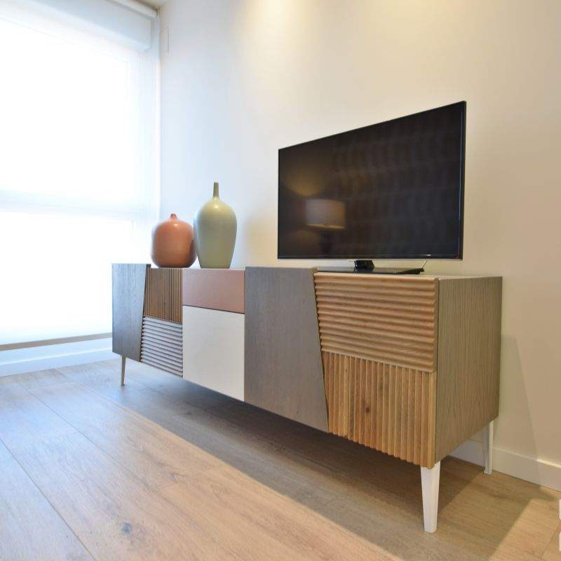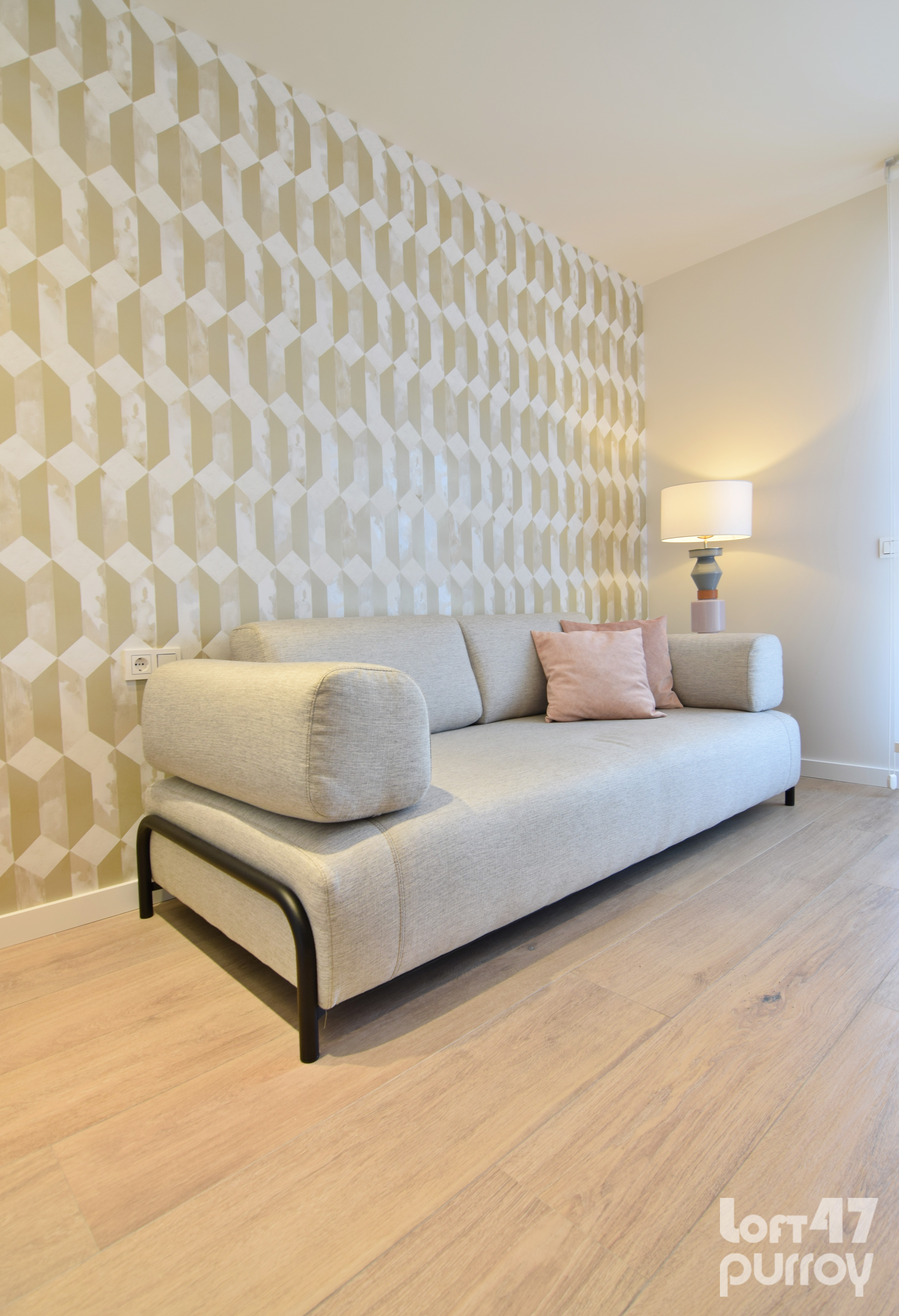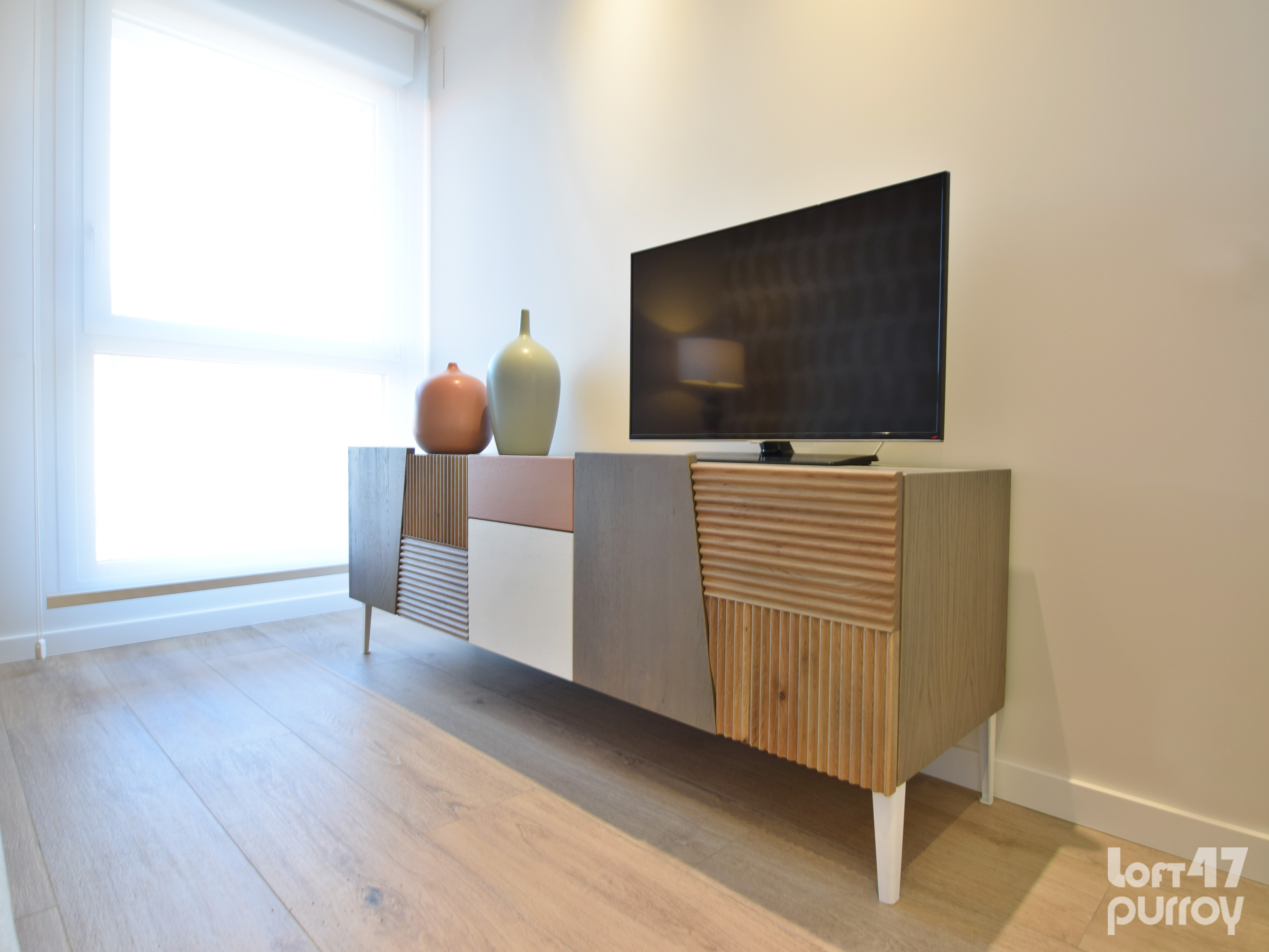 Este espacio se configura como una estancia de estar, entre la zona día y la zona noche. Una zona multiusos que permite transformarse en un dormitorio para invitados.