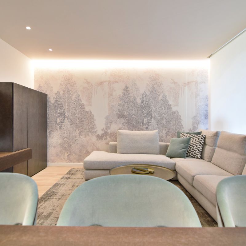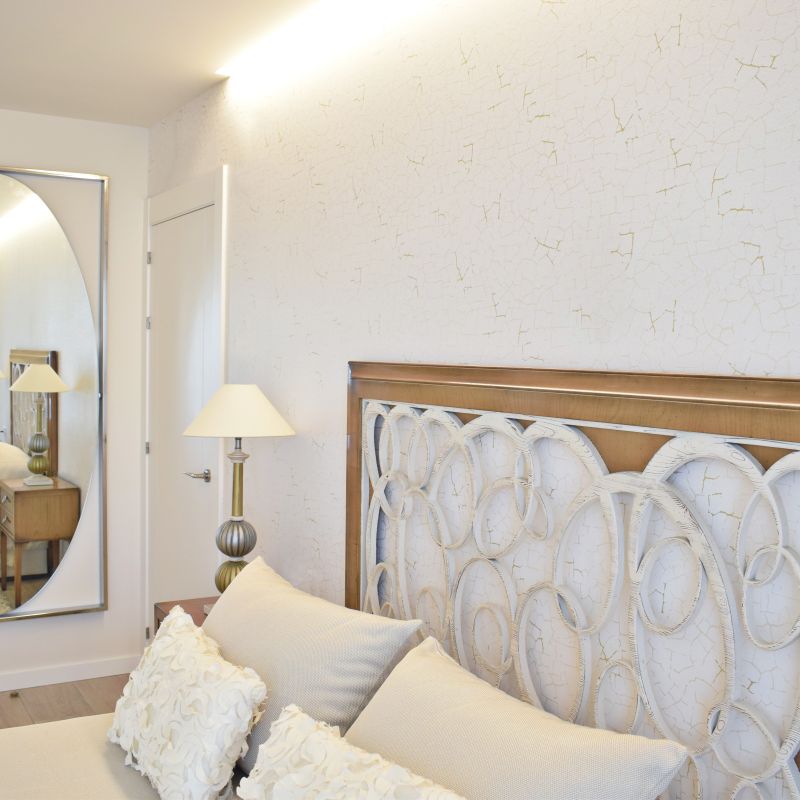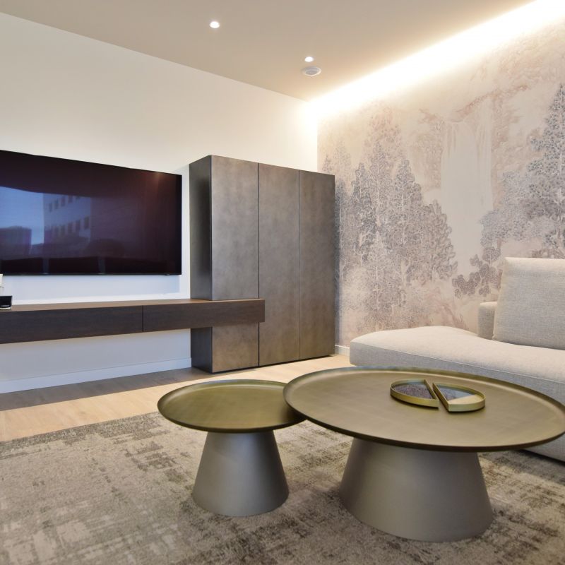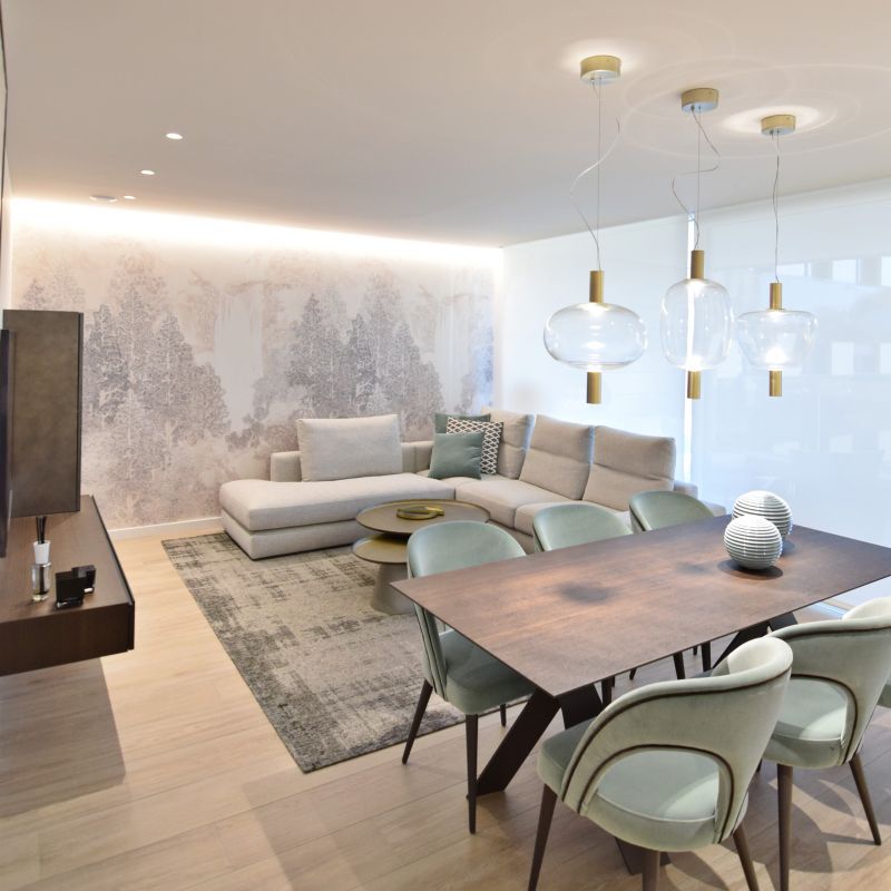 El salón-comedor-cocina se unifican en una única estancia gracias a una gran #terraza que conecta la zona día. Un espacio en tonos #cálidos donde la madera es la protagonista de esta estancia, junto con las lacas metalizadas y un gran mural que enmarca el #salón.