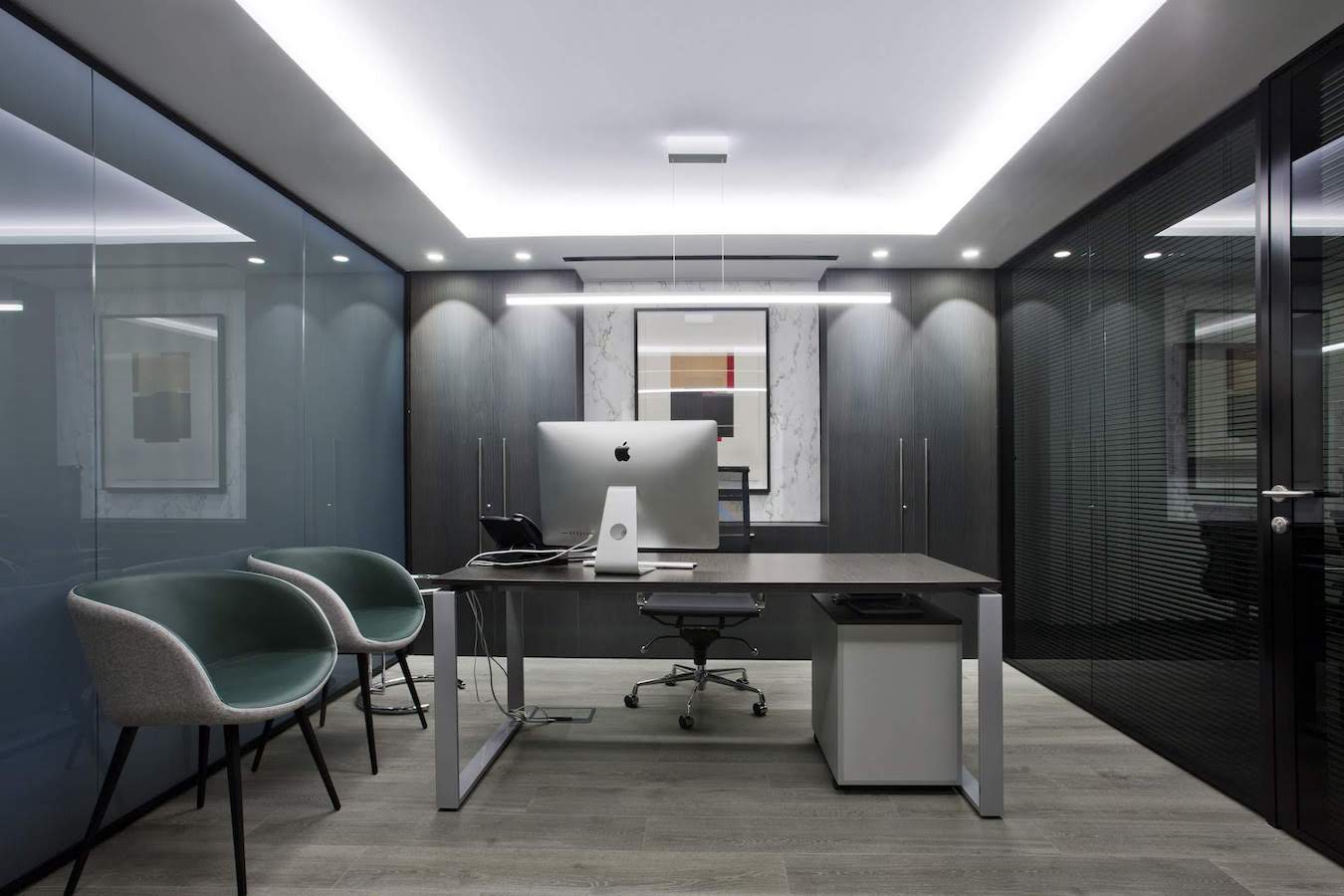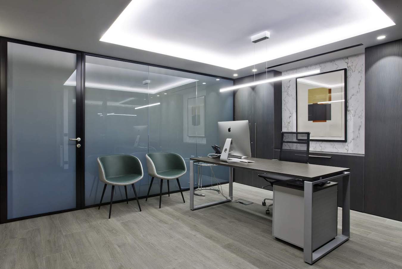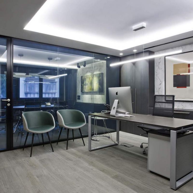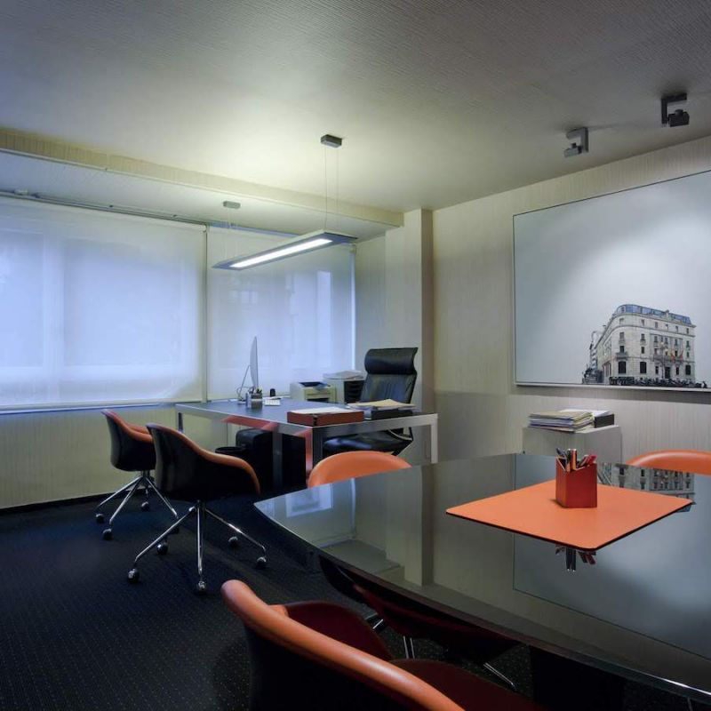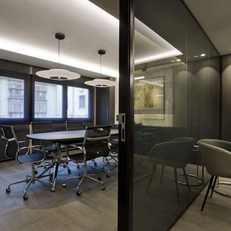 Este proyecto hemos conseguido fusionar la estética con la funcionalidad. La conexión visual de los espacios para aportar amplitud, es tan importante, como la privacidad para la atención individualizada y de reunión. Este reto lo hemos conseguido gracias a una división de vidrio con sistema ionizado de la empresa Dynamobel. Una solución permite que la sala de reuniones se convierta en un espacio transparente u opaco según las necesidades del momento.