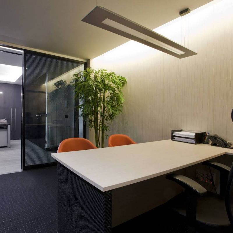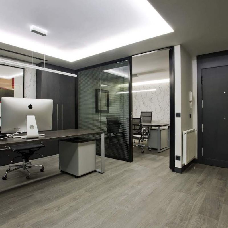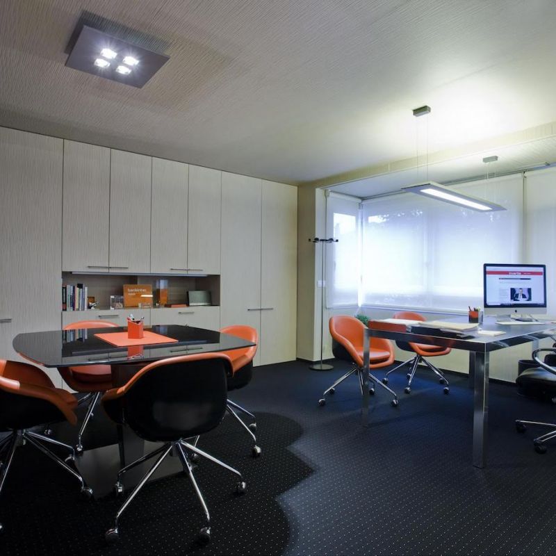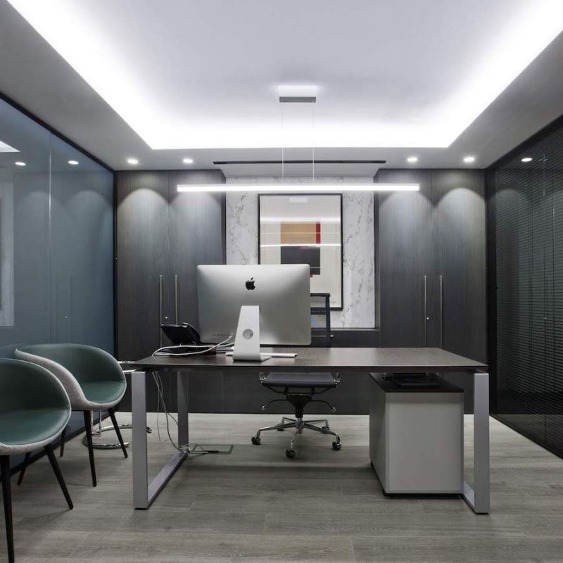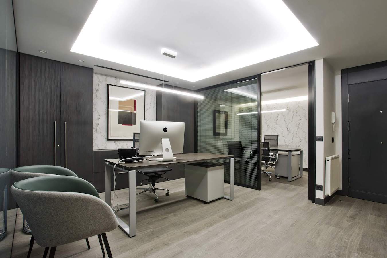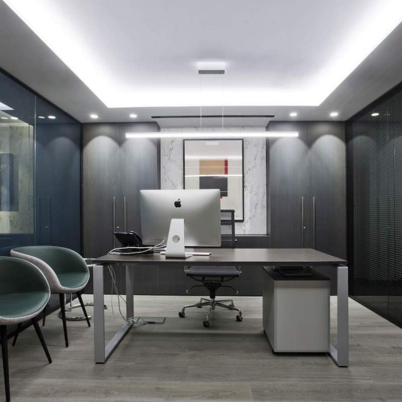 Este proyecto hemos conseguido fusionar la estética con la funcionalidad. La conexión visual de los espacios para aportar amplitud, es tan importante, como la privacidad para la atención individualizada y de reunión. Este reto lo hemos conseguido gracias a una división de vidrio con sistema ionizado de la empresa Dynamobel. Una solución permite que la sala de reuniones se convierta en un espacio transparente u opaco según las necesidades del momento.