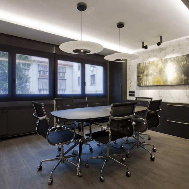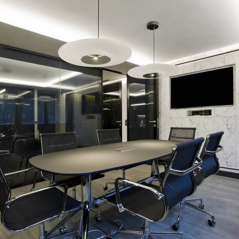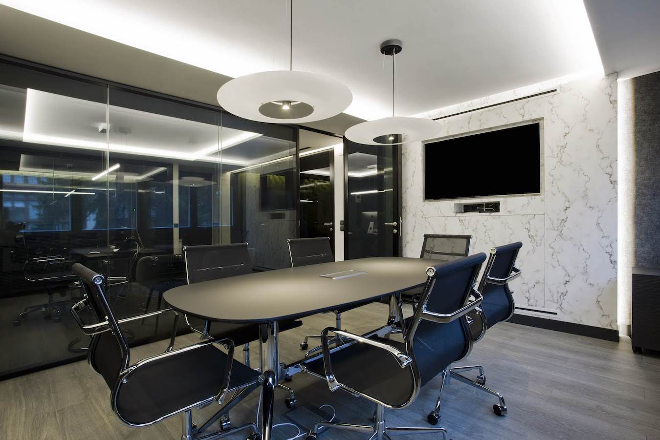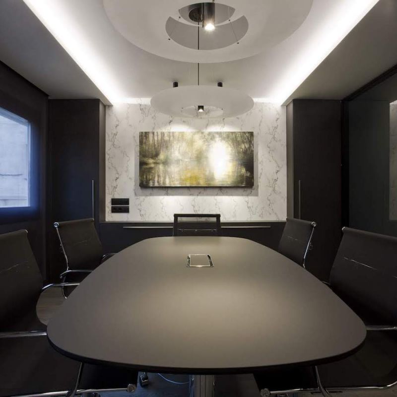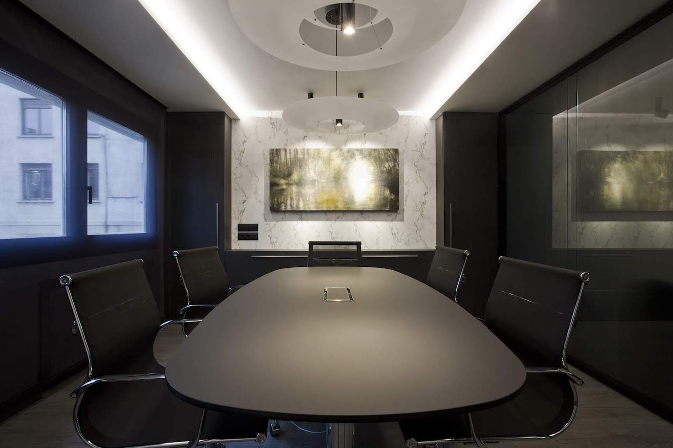 La sala de reuniones mantiene el mismo estilo cromático con muebles especiales diseñados para este espacio. En este caso, el juego de alturas del techo retroiluminado potencia una mesa central de reuniones. Una mesa junto con sillas de trabajo en tonos negros y acero cromado.