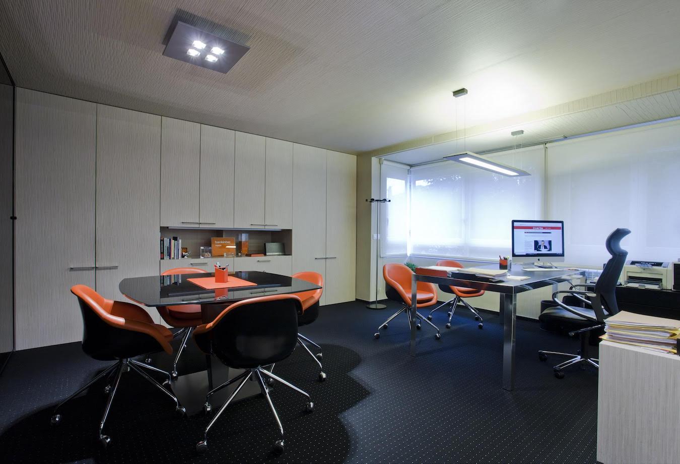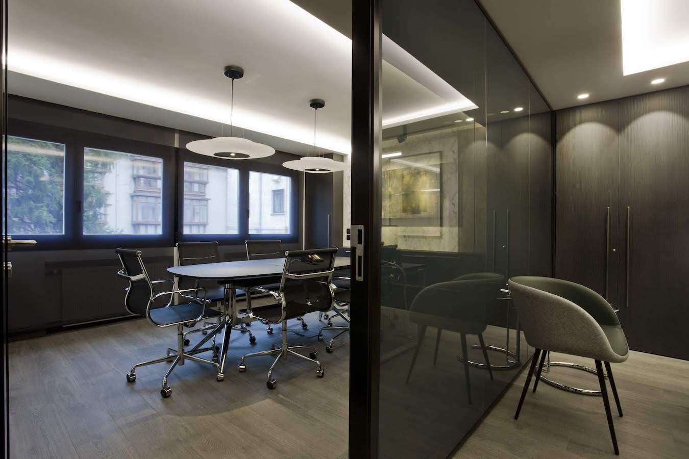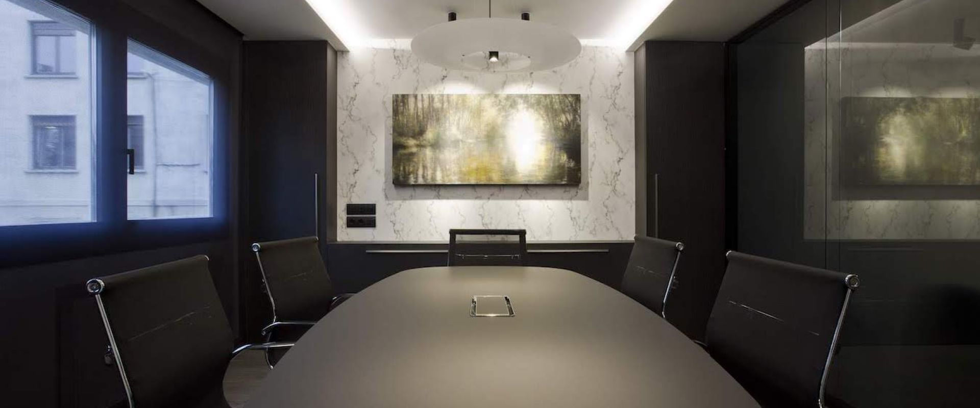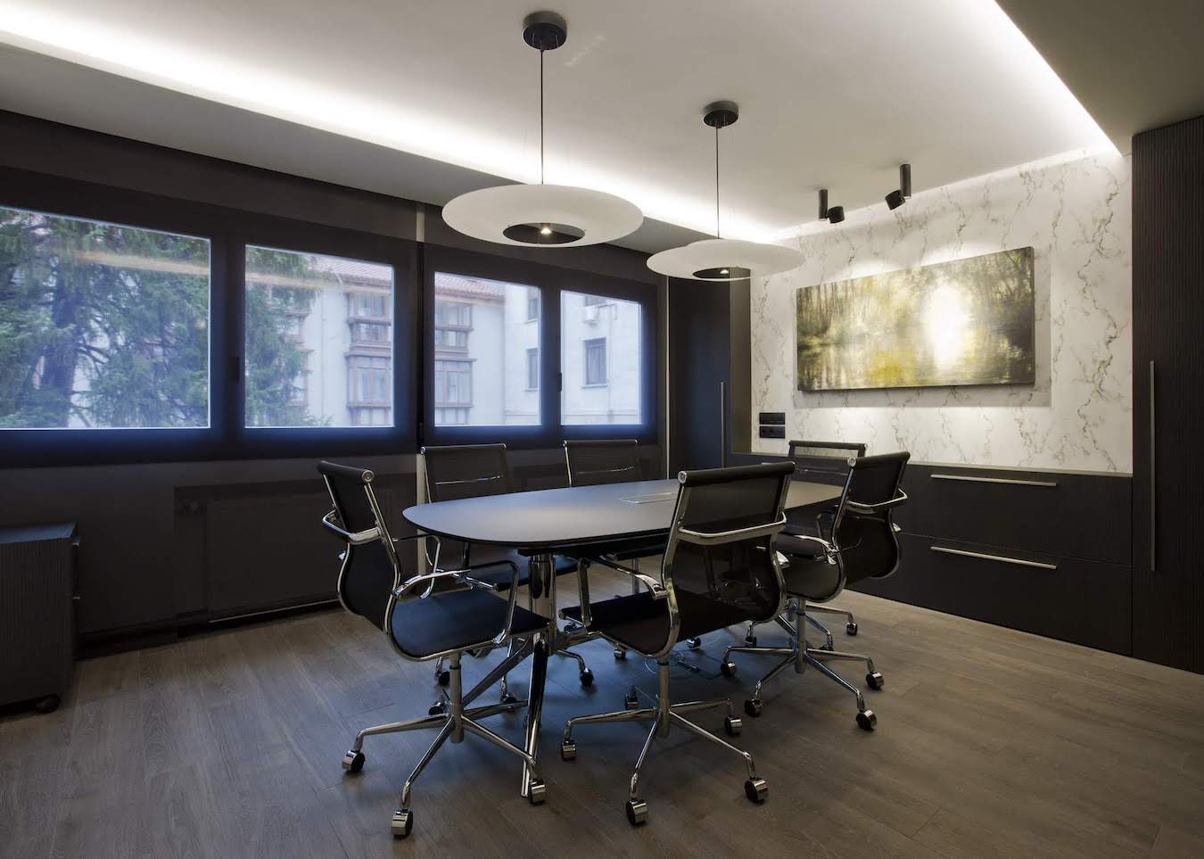 La sala de reuniones mantiene el mismo estilo cromático con muebles especiales diseñados para este espacio. En este caso, el juego de alturas del techo retroiluminado potencia una mesa central de reuniones. Una mesa junto con sillas de trabajo en tonos negros y acero cromado.