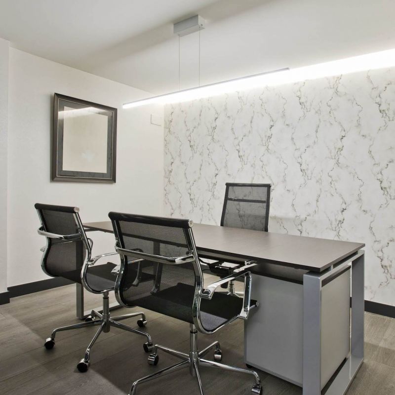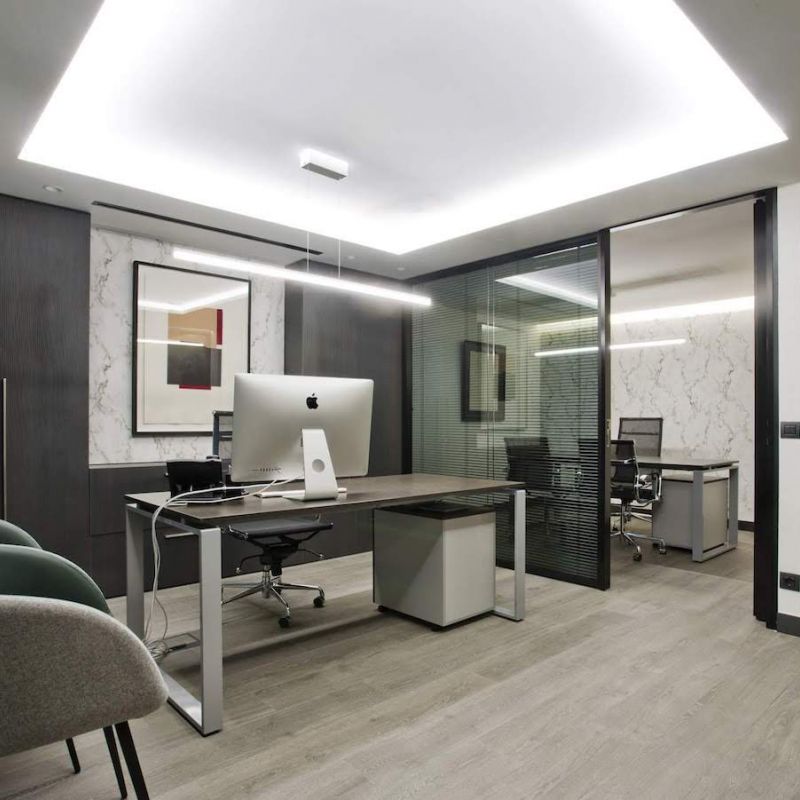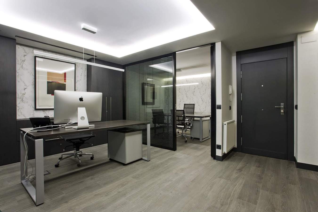 Manteniendo esta primera zona con su mobiliario, hemos diseñado una extensión dando solución al programa de necesidades de nuestro cliente. Una ampliación con un estilo sofisticado y sobrio, que combina la madera en tonos oscuros con un papel de mármol. Estos nuevos espacios enmarcan las zonas de trabajo gracias a los nuevos techos retro-iluminados que añaden el toque vanguardista.