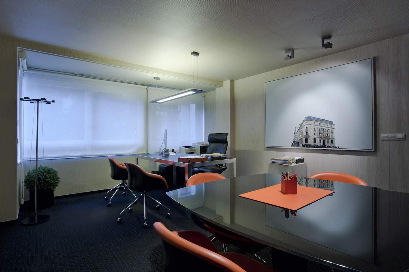 En primer lugar, una zona de recepción que funciona como eje de distribución hacia el resto de estancias de la oficina. El mobiliario se compone de una mesa central de líneas puras como punto de atención al cliente. Las dos butacas colocadas en un lateral funcionan como una zona de espera además de aportan el toque de color a la estancia. En un segundo plano encontramos un amario de almacenamiento diseñado a medida.