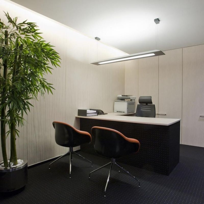 La iluminación es un punto que se ha cuidado con todo el proyecto. La luz de ambiente de los techos se complementa con la iluminación de acento sobre las mesas de trabajo. Es el caso de la sala de reuniones, con dos piezas suspendidas del techo y aspecto escultórico.